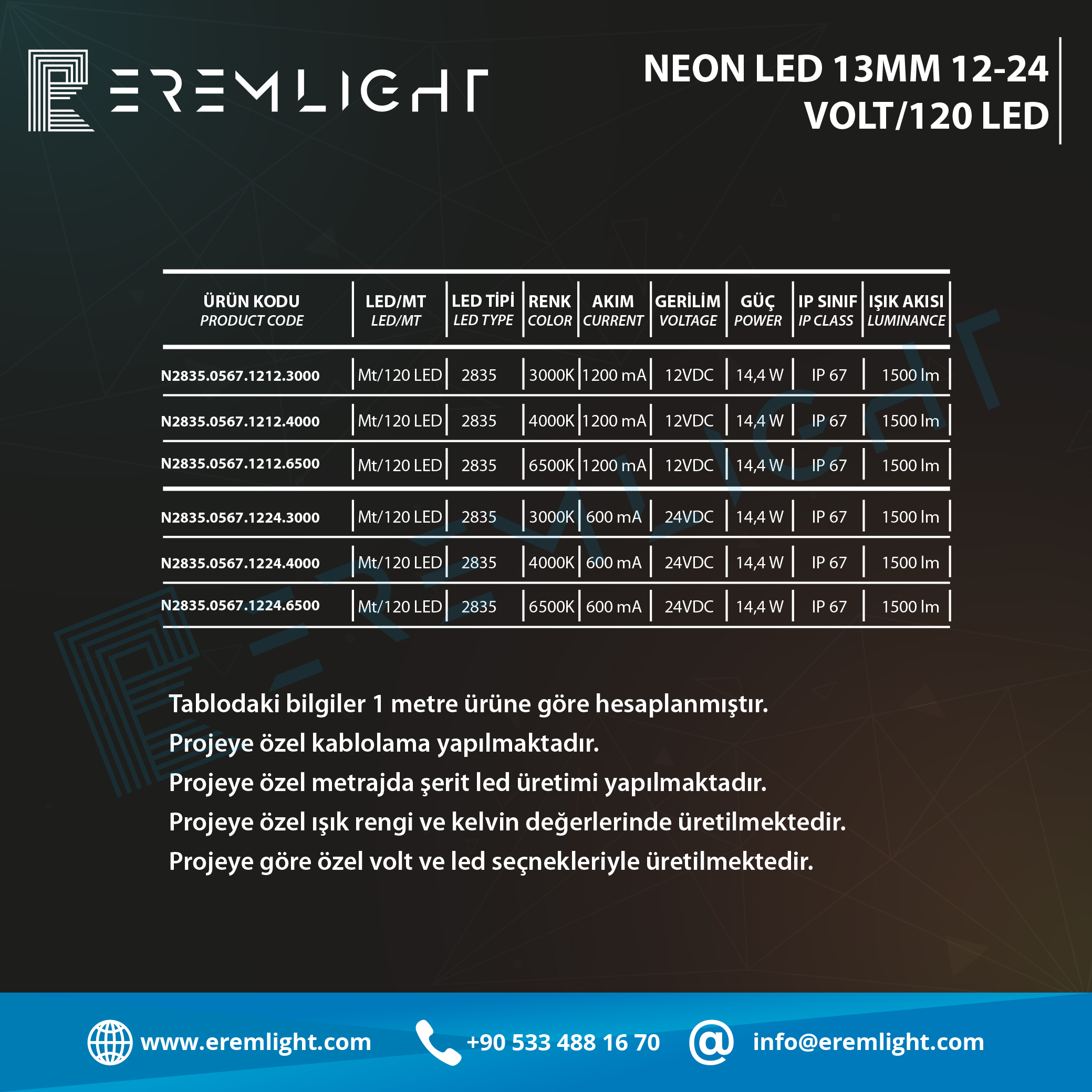 Projeye özel ışık rengi ve kelvin değerlerinde üretilmektedir.