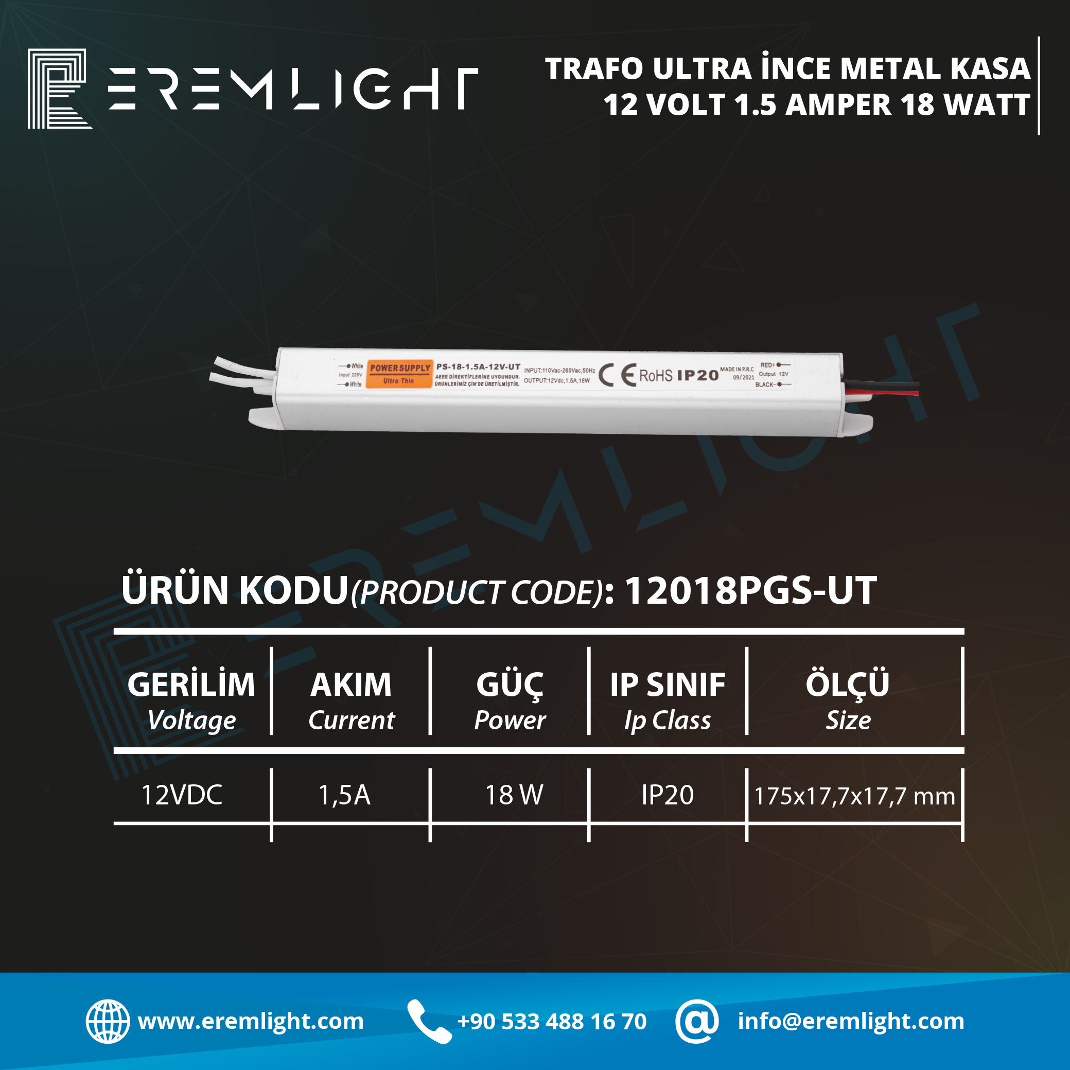 TRAFO ULTRA İNCE METAL KASA 12 VOLT 1.5 AMPER 18 WATT